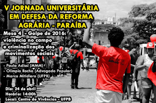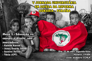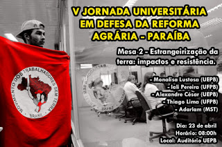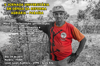 Estão abertas as inscrições para a 5ª Jornada Universitária em Defesa da Reforma Agrária – Paraíba, que acontecerá entre os dias 20 e 24 de abril de 2018 em diferentes campus universitários do estado. O evento é gratuito e aberto ao público, tendo como objetivo garantir visibilidade à realidade da reforma agrária proporcionando debates sobre suas múltiplas dimensões, como o processo de criminalização sofrido pelas(os) trabalhadoras(os) implicadas(os) nessas lutas por direitos; a denúncia de situações de violência vivenciadas por tais trabalhadoras(es); as políticas direcionadas à educação do campo; os conflitos em torno da estrangeirização das terras no país; e os processos de Estado acerca da titularização e da privatização dos assentamentos da reforma agrária. Em caráter debatedor, na mesa “Estrangeirização da terra: impactos e resistência” do dia 23/04, o evento contará com a participação do Prof. Dr. Thiago Lima da Silva (UFPB) e sua orientanda Iale Pereira (UFPB).